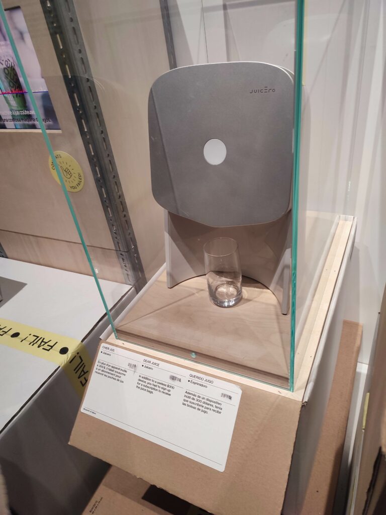 Parmi les premiers flops présentés, le pressoir Juicero proposait en 2016 pour pas moins de 700 dollars de presser des poches de fruits ou de légumes frais pour obtenir des jus, alors que l’on obtenait le même résultat en pressant les pochettes à la main. La Hot Bertha, la bouillotte de Philippe Starck, beau joueur puisqu’il est partenaire de l’exposition, était dotée d’un manche très design, mais qui laissait échapper de la vapeur bouillante sur les mains.